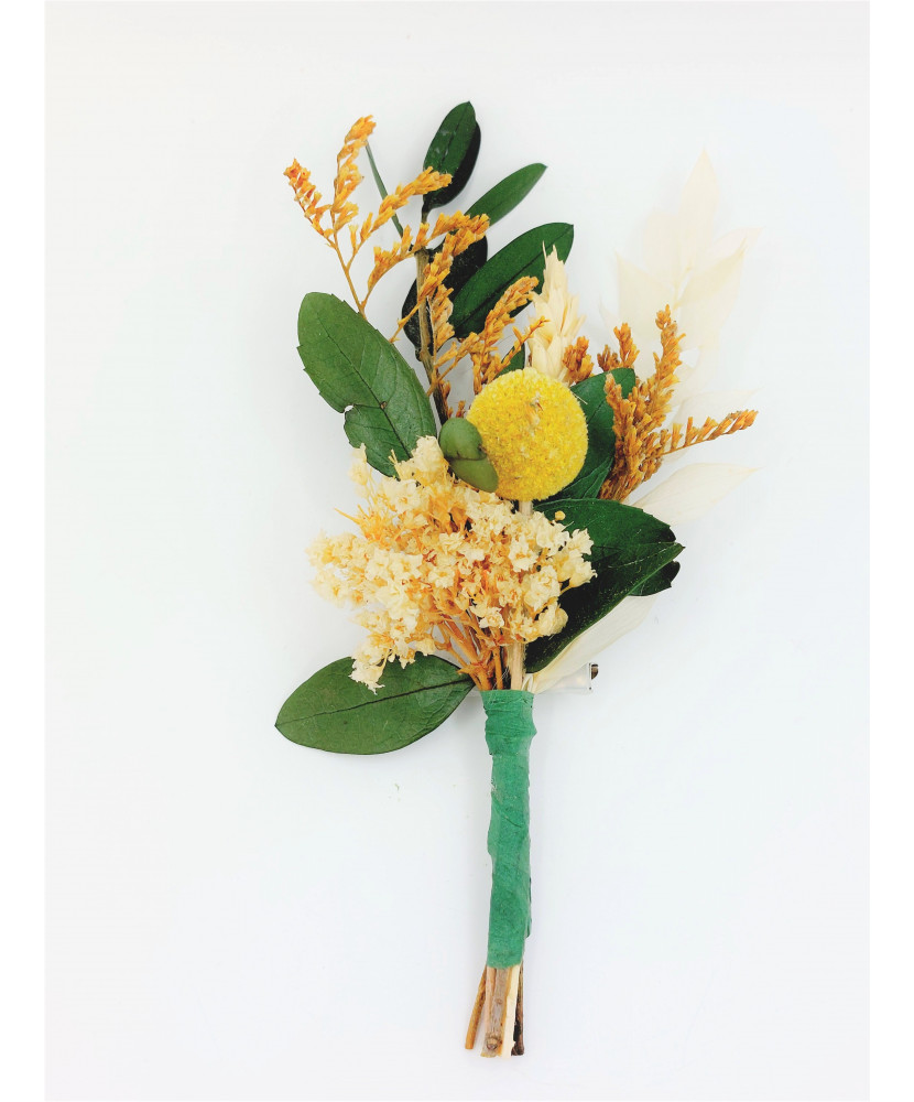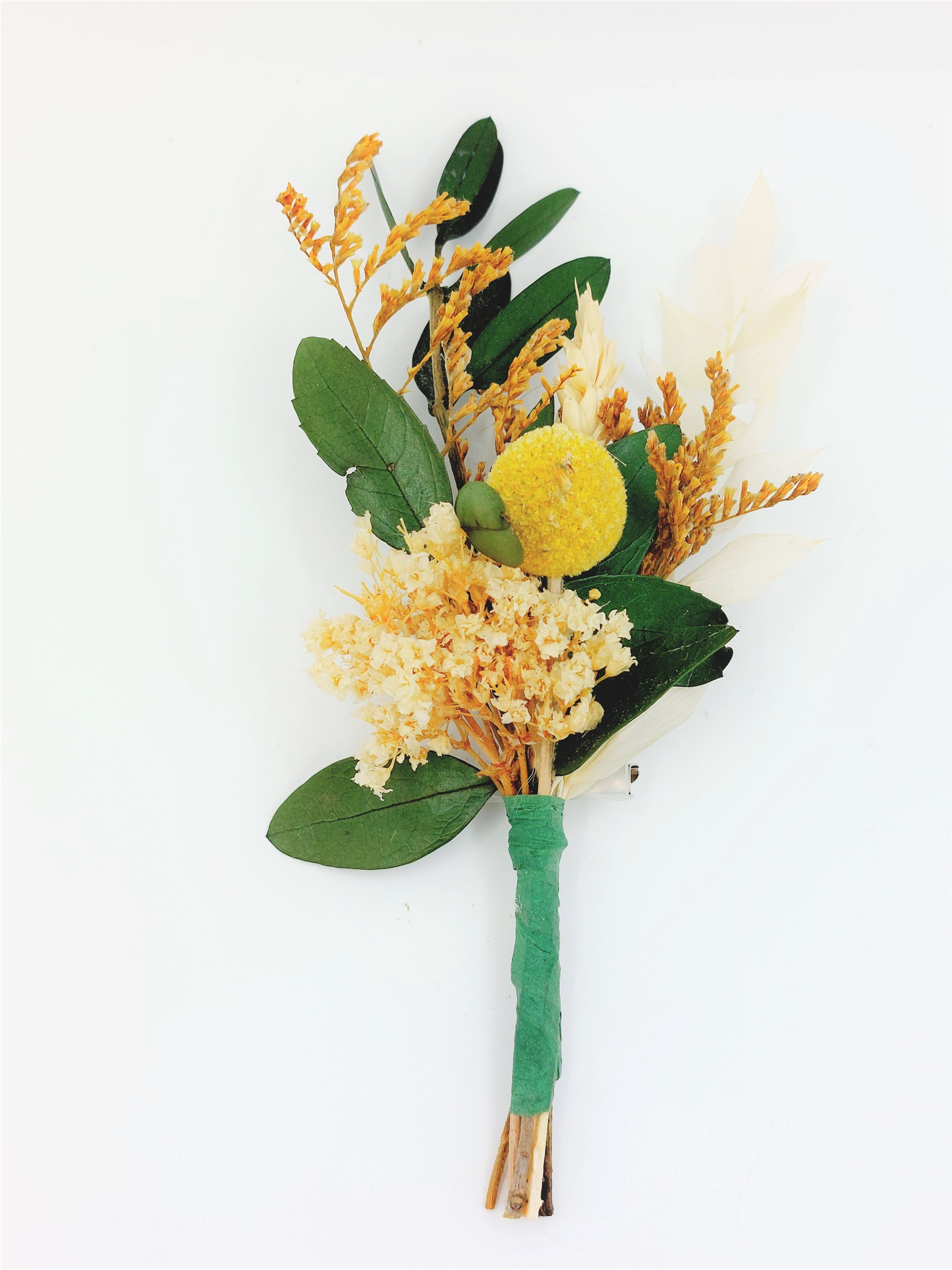 Boutonnière Émeraude: Elegancia Natural en Flores Preservadas