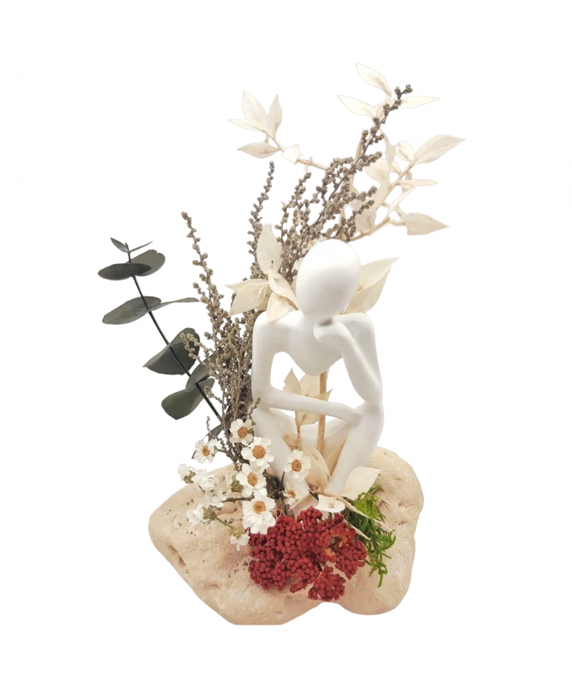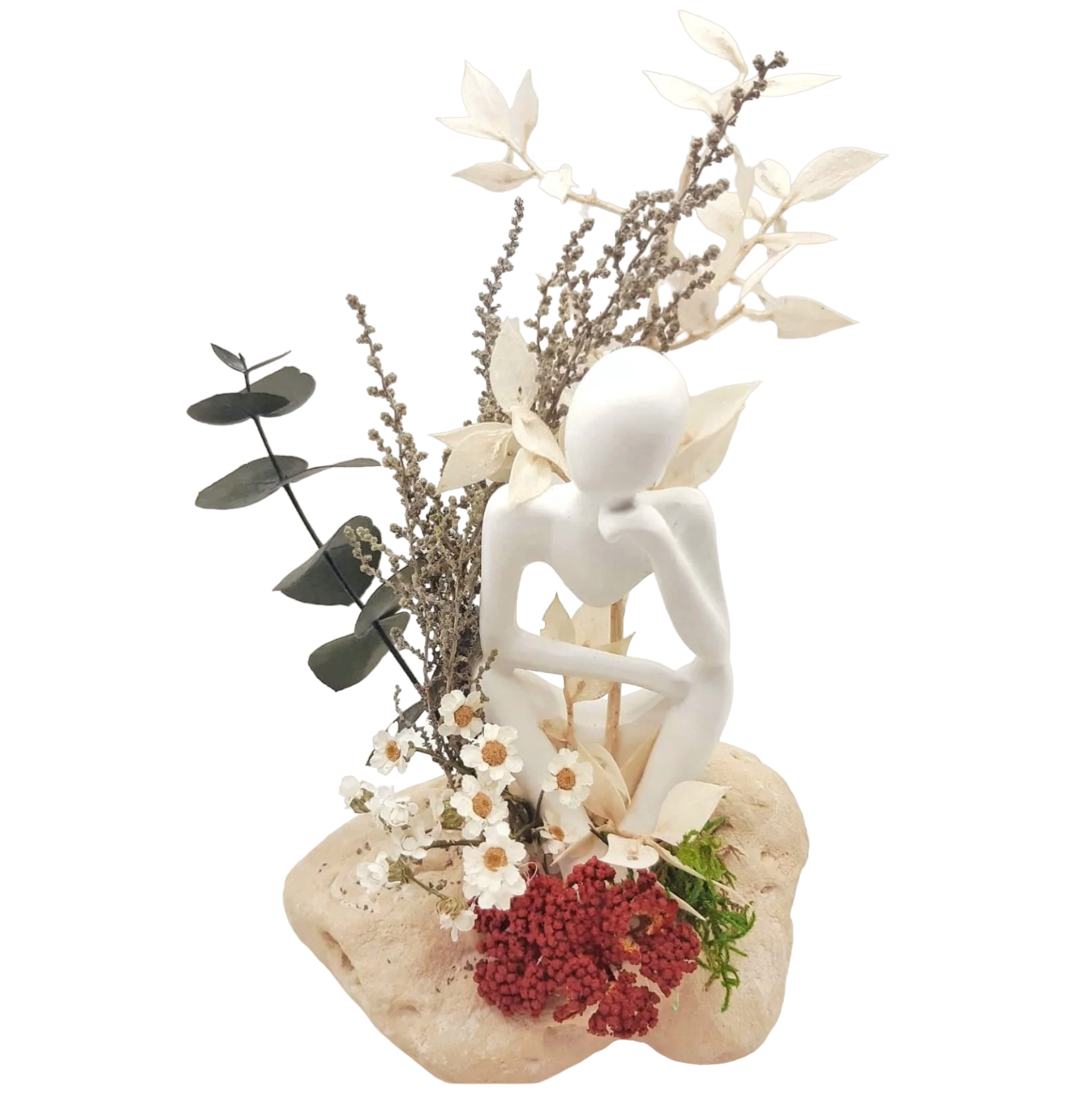 Esta encantadora pieza decorativa se destaca por su base de piedra de marés natural, que le confiere una autenticidad única. La figura sedente, combinada con flores preservadas, crea una representación encantadora, evocando la sensación de un jardín que ilumina y decora tu espacio de manera extraordinaria.