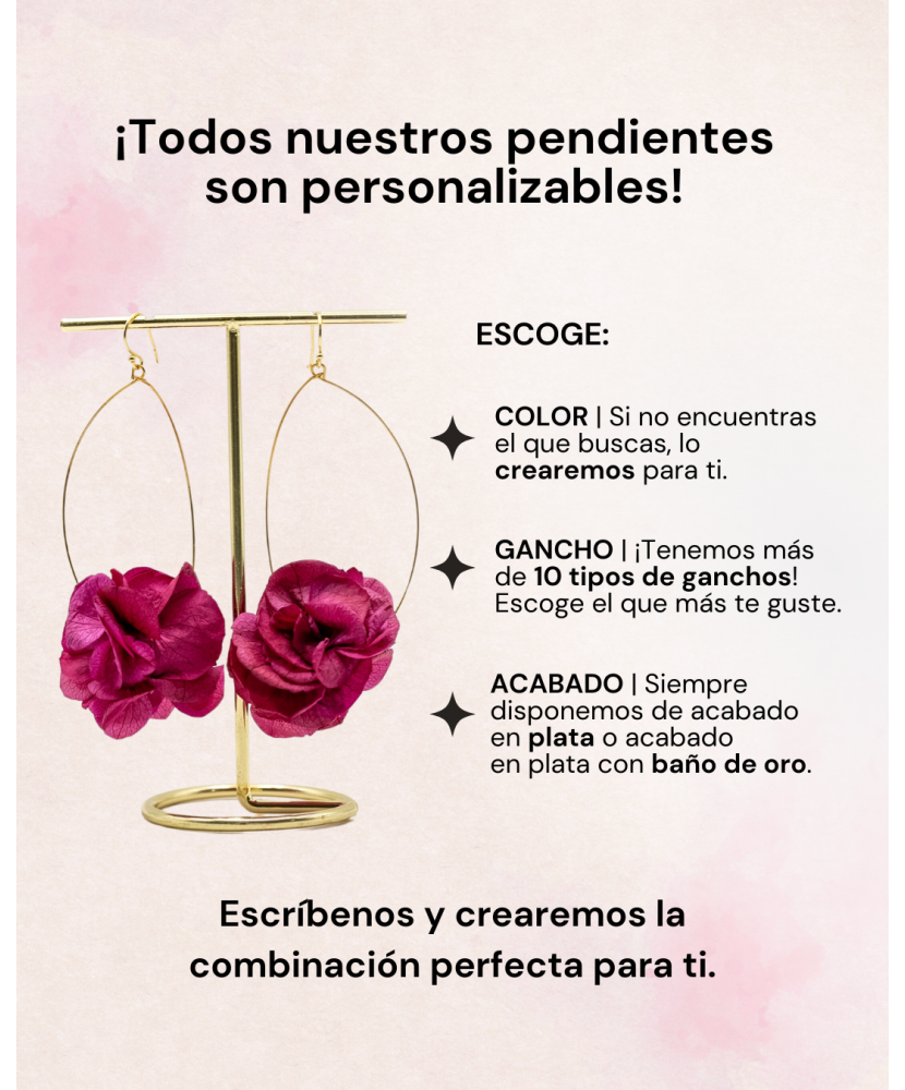 Discover our Haira earrings in Aro Grande, a unique jewel that highlights the beauty of flowers preserved from Hortensia. Designed to enhance your style on any occasion, these slopes stand out for its exclusivity, because, as well as there are not two equal flowers, each pair is unique and unrepeatable.