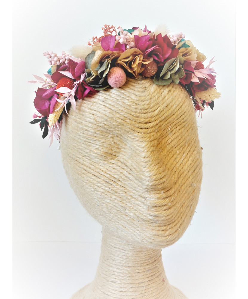All of our preserved flower crowns are unique and exclusive, made with preserved natural flowers, also known as stabilized flowers. This preservation process is carried out by selecting specific flowers collected at the time of maximum splendor.