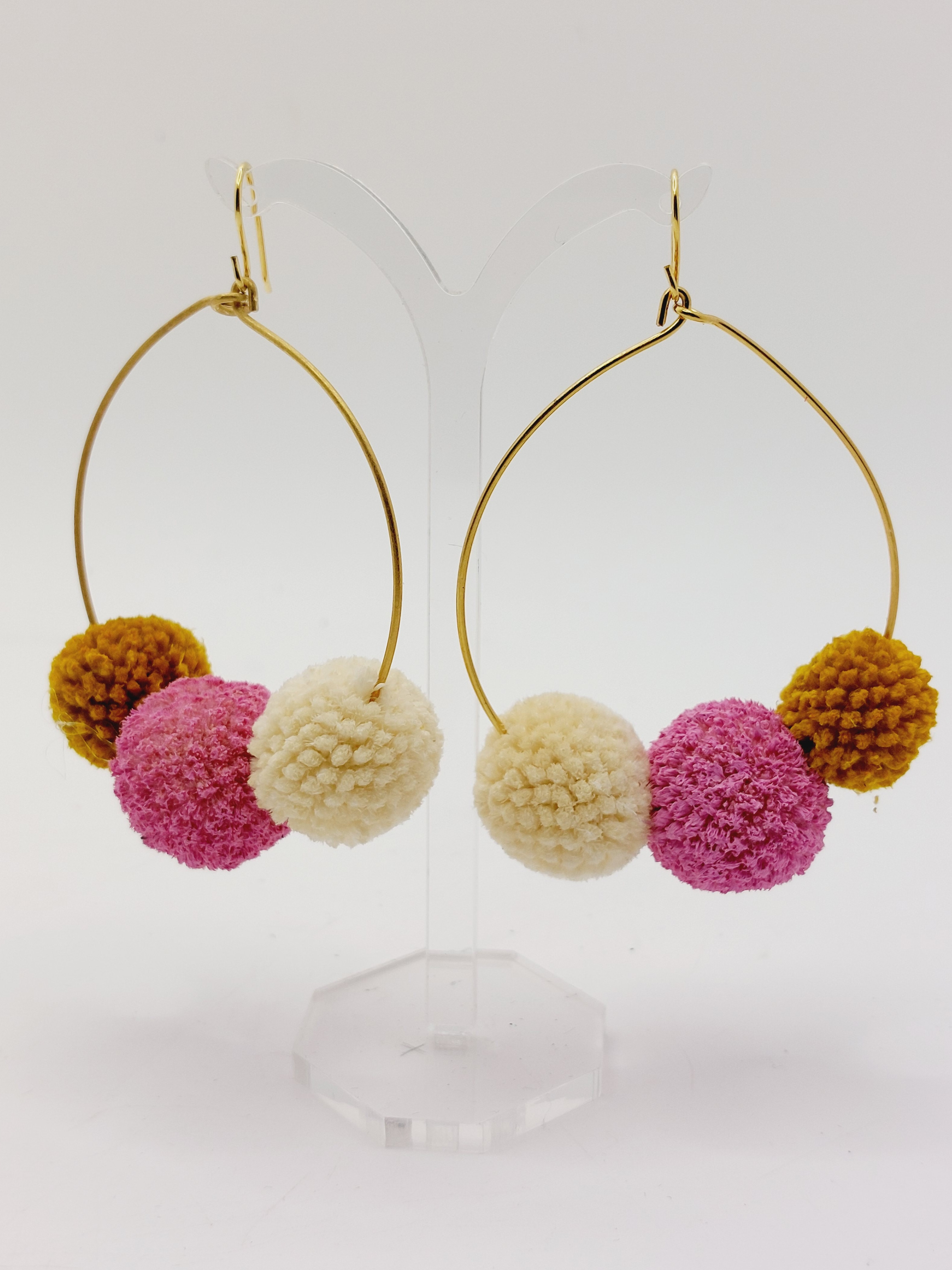 Te presentamos nuestros pendientes de craspedia en color Rosa. Sin embargo, también puedes elegir entre otras flores como Gypsophila (Paniculata), Broom, Ruscus, Eucalipto, Amarelino, Hill Flower (Cardo), Lavanda, Trigo, Hortensias... Los colores pueden ser personalizados según tu gusto, siempre que estén disponibles.